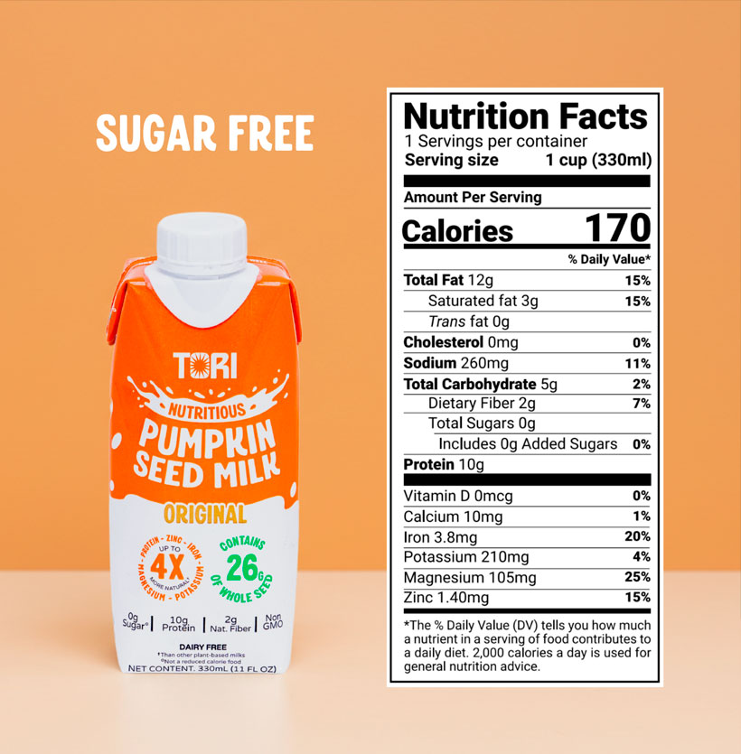 Nutritious - OriginalWater, pumpkin seed Cucurbita argyrosperma, sea salt, natural vanilla flavor, locust bean gum (natural, plant-based stabilizer), natural sweet flavor, monk fruit (sweetener).This plant-based milk is made from pumpkin seeds (Cucurbita argyrosperma from Central America's Mayan region) and contains 26g of whole seed—delivering 4X more natural protein, iron, zinc, magnesium, and potassium than other plant-based milks, with a smooth, creamy texture and delicious, subtly sweet taste from monk fruit. 170 calories of pure, dairy-free energy.